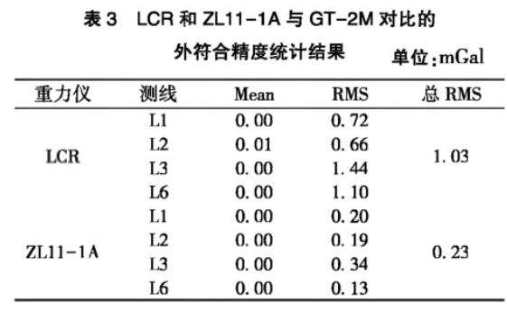 将GT-2M重力仪的实测数据作为“真实”重力异常验证LCR和ZL11-1A海洋重力仪的外符合精度。分别用LCR和ZL11-1A重力仪在每条重复线上的均值减去GT-2M在每条重复线上的均值的差值,来评估各自的外符合精度。其中,LCR的外符合RMS精度为1.03 mGal,ZL11-1A的外符合RMS精度为 0.23mGal。