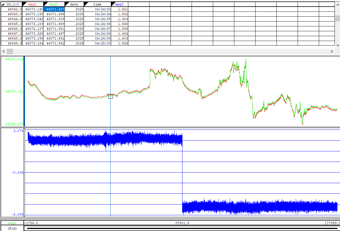 48小时磁力梯度仪静态数据,采集频率1HZ。两台磁力仪和梯度仪的曲线见下图,中途将磁力仪位置调换。