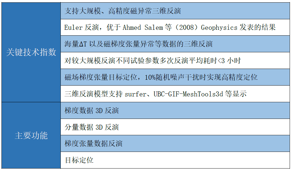 高精度磁异常三维反演软件主要针对高精度磁测数据的精细反演编制,包含有磁力Euler反褶积(支持磁异常三方向梯度及三维解析信号振幅计算),其反演效果在给定的模型试验中优于Ahmed Salem等(2008)Geophysics发表的结果;以及磁异常三维磁性成像,支持PC机实现三维反演,三维反演模型支持surfer、UBC-GIF-MeshTools3d等地球物理常用的商业软件,支持较大规模的三维反演。