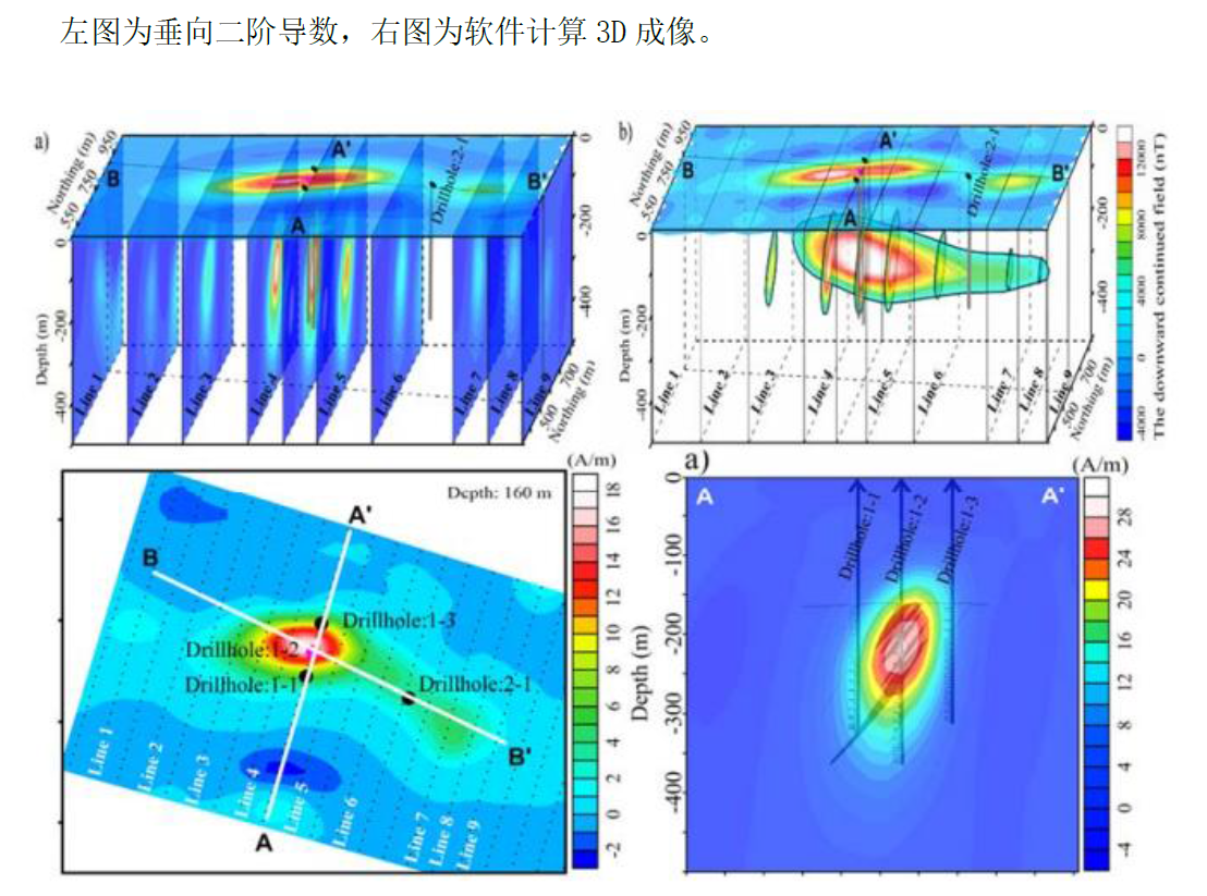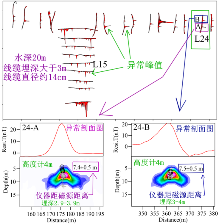 2)24 线 A、B 两点磁源深度距仪器 6.9-7.9m,仪器距底约 4m,即磁源埋深约 24-A 点 2.9-3.9m;24-B 点 3-4m,误差范围 1m 以内。