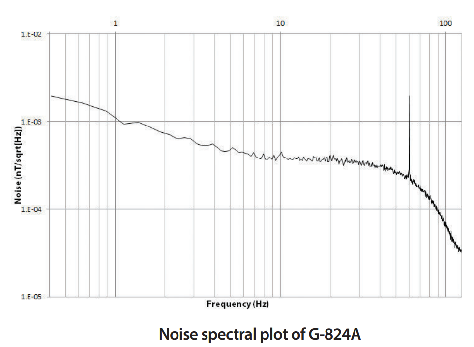 噪声水平是在静磁(抵消了日变影响)实验室中改变采集频率得到的,下图是国外G824A所作的噪声/频率曲线,噪声水平接近0.001nT/Sqrt(Hz),图中60Hz有个跳点是美国交流点的频率是60Hz。