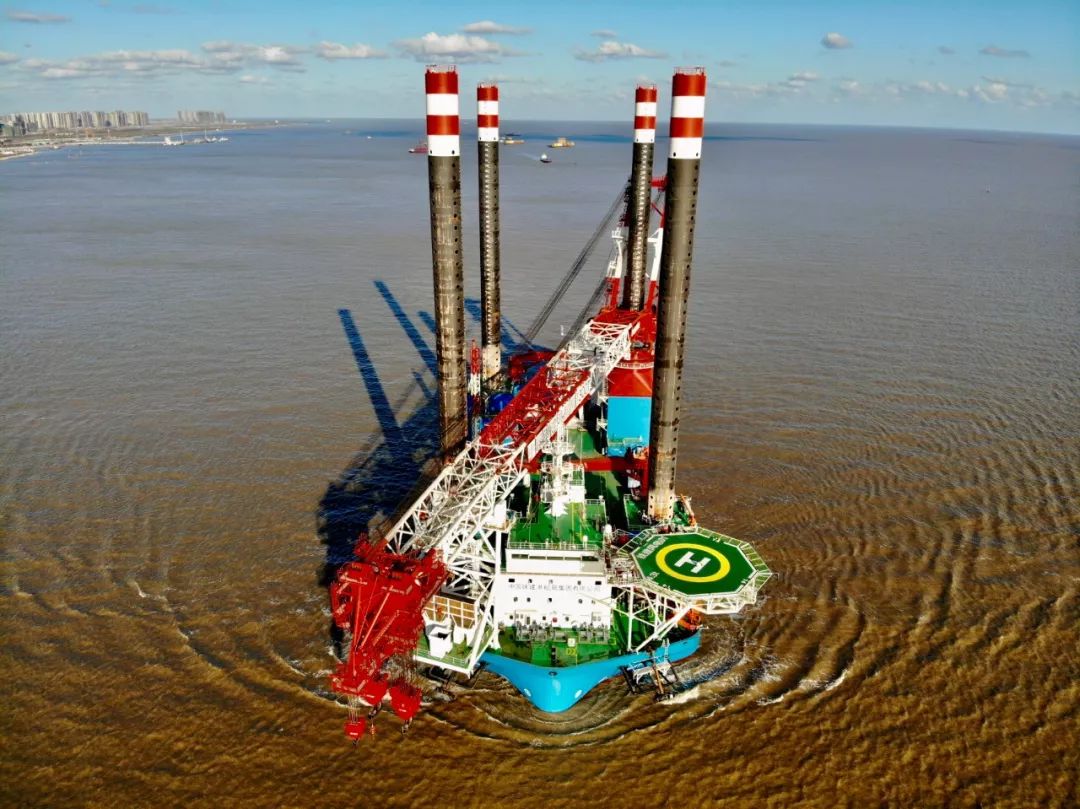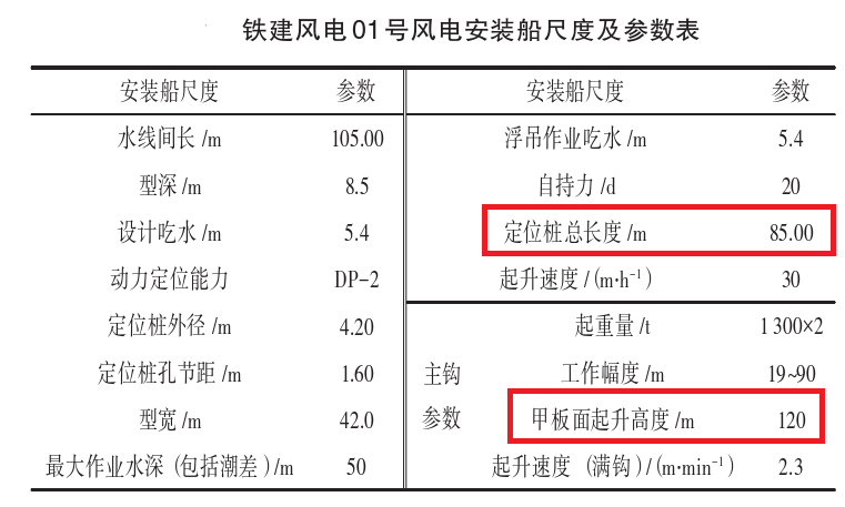 风机采用单桩基础,施工采用自有多功能海上自升式“铁建风电01号”风电安装船。