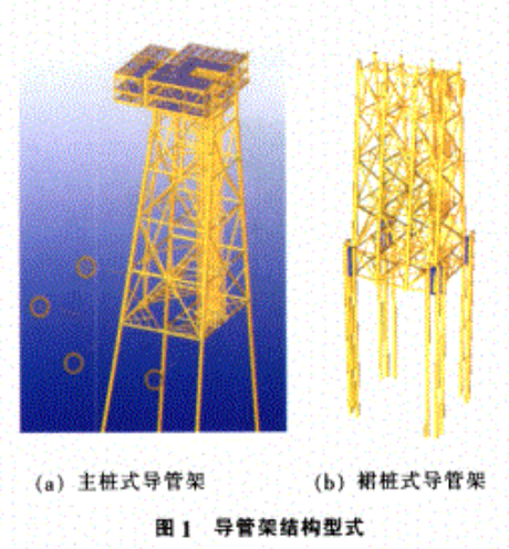 导管架采用裙桩形式,不同于传统式浅水导管架设计形式。浅水区域一般采用主桩式结构,即桩由导管架主腿内导入。深水区通常采用裙桩式导管架结构。