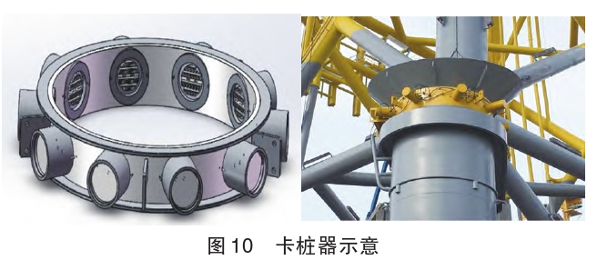 卡桩器焊接固定在导管架裙桩套筒顶部,起着辅助调平导管架(在打桩过程中)和临时固定钢桩与导管架(打桩完成后、 灌浆之前)的作用。