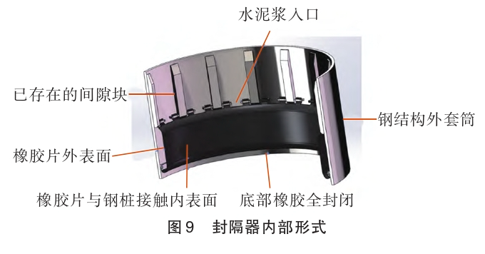 桩管沉桩完毕,需要对接桩管与导管架裙桩 套筒之间的区域进行灌浆。灌浆连接段是导管架 基础结构承上启下的关键部位,灌浆质量的好坏 影响到整个导管架的整体安全和稳定。封隔器安 装在导管架套筒底部,负责封堵灌入的泥浆。