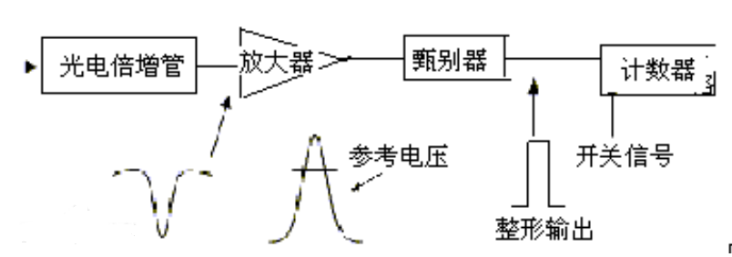 光电倍增管光子计数器主要由光电倍增管、放大器、甄别器和计数器组成。当计数器工作时,光电倍增管的光电阴极接受光辐射的照射,在光电倍增光的负载上形成了一系列的电脉冲,把它连接到放大器上。这些脉冲经放大器放大后,加在甄别器的输入器上,甄别器滤除部分噪音脉冲,只允许那些和光辐射功率成正比的脉冲通过,并送入计数器。
