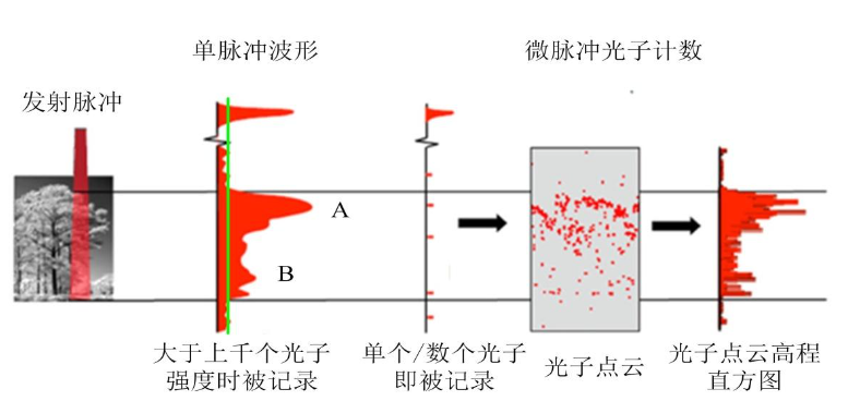 光子计数(也称单光子)激光雷能够检测极微弱光脉冲,灵敏度达到单个光子级别。我们不用再通过记录波形获得点云,而是探测到一个光子,就记录一次时间,生成一个位置,最终获得数量庞大的光子点云。此时我们从远距离发射一束功率不太强的激光,只要有数个光子返回,就能达到测量目的。
