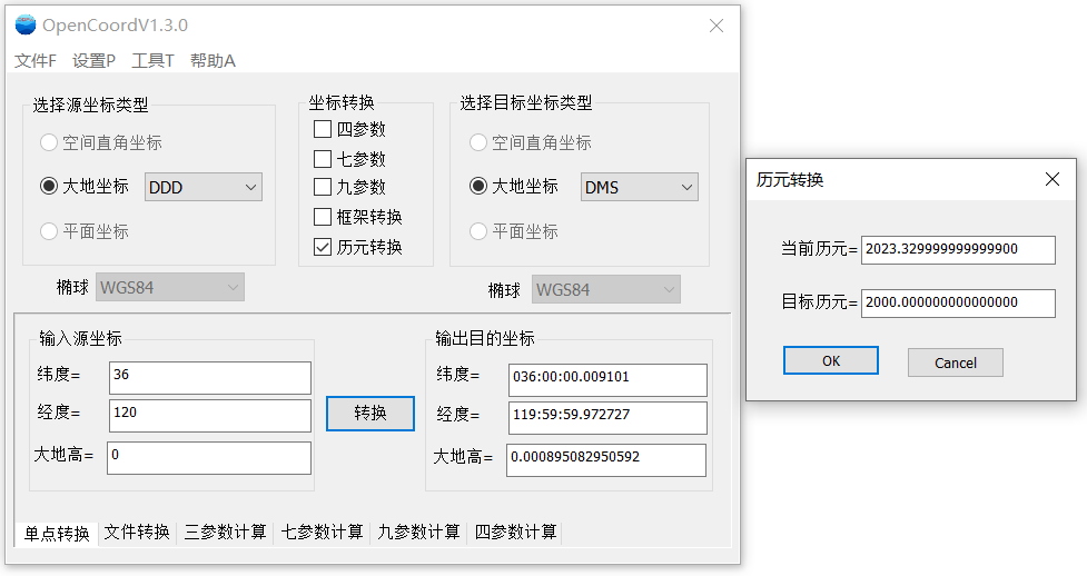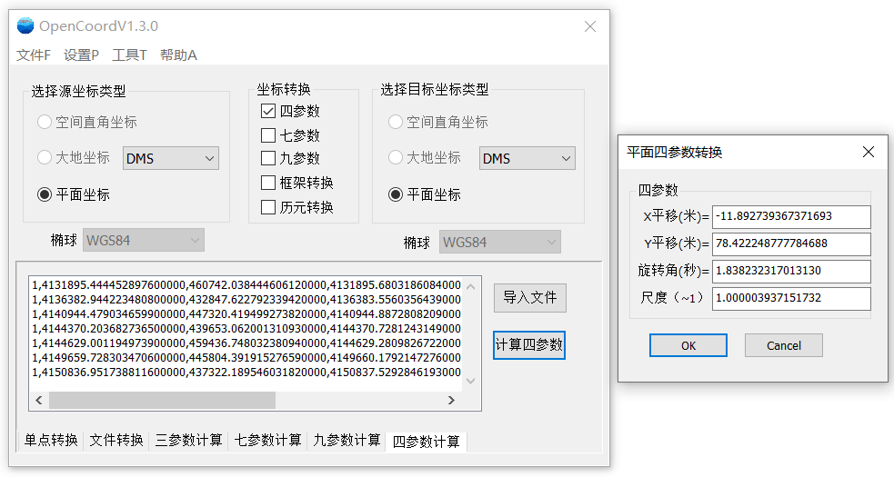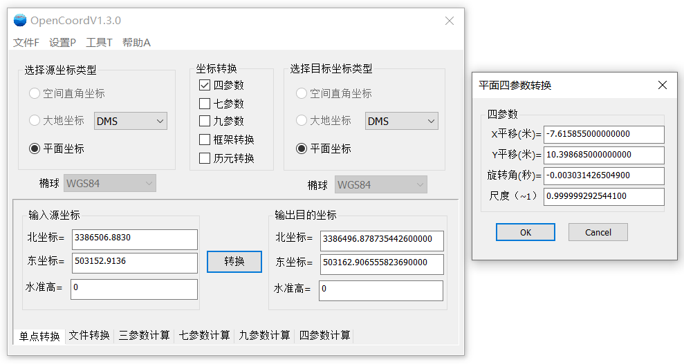 坐标转换软件OpenCoord新增平面四参数转换、规范法历元转换等功能,版本号更新为1.3.0,欢迎同行下载使用。下载的网页地址为:http://www.xiaokcehui.com/?post=93。