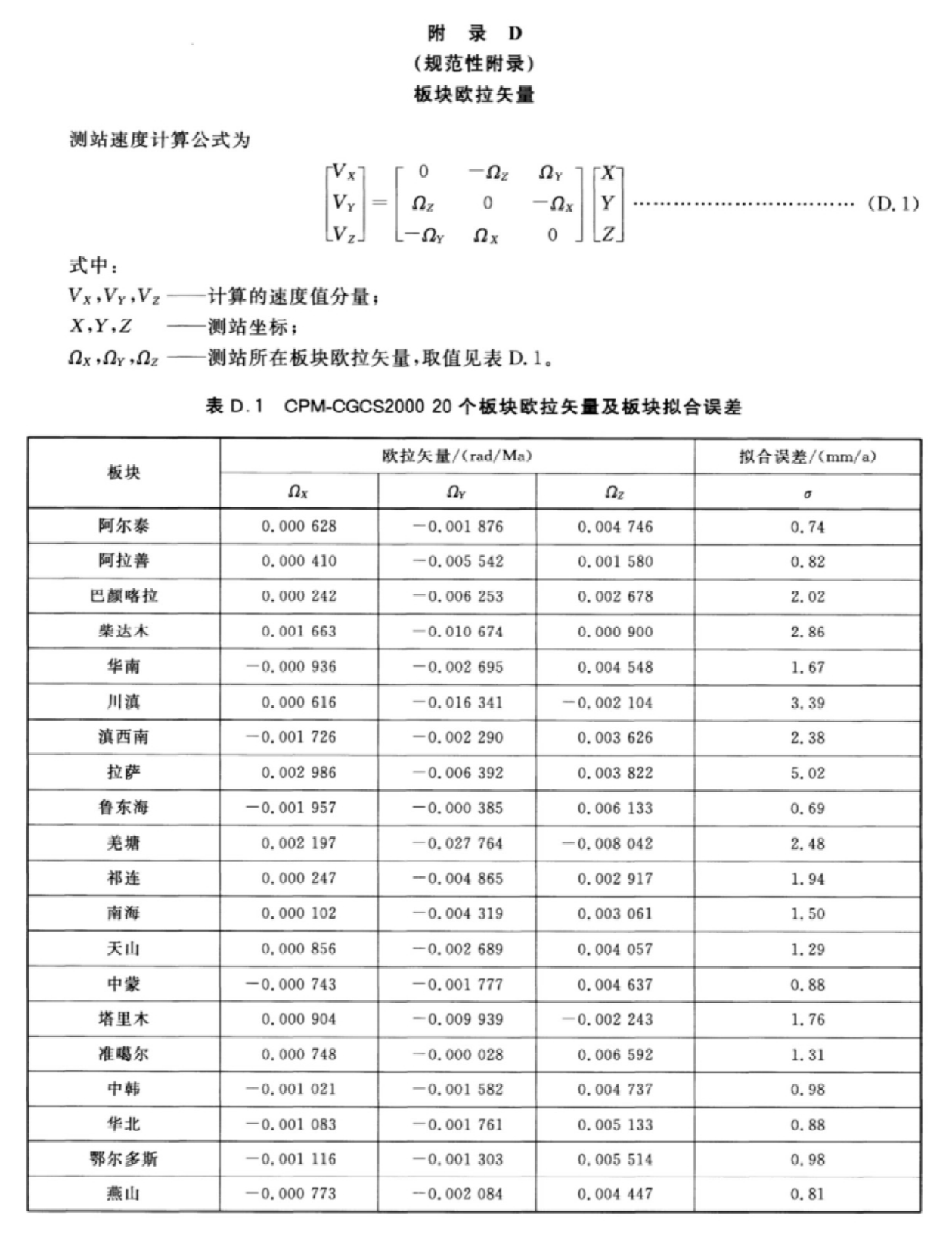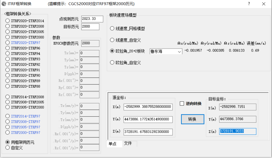 根据《CH∕T 2014-2016 大地测量控制点坐标转换技术规范》5.1.4 框架转换,使用CPM-CGCS2000速度场模型(见附录D)计算卫星导航定位基准站坐标从观测历元到需转换历元期间,由于板块运动引起的坐标变化。