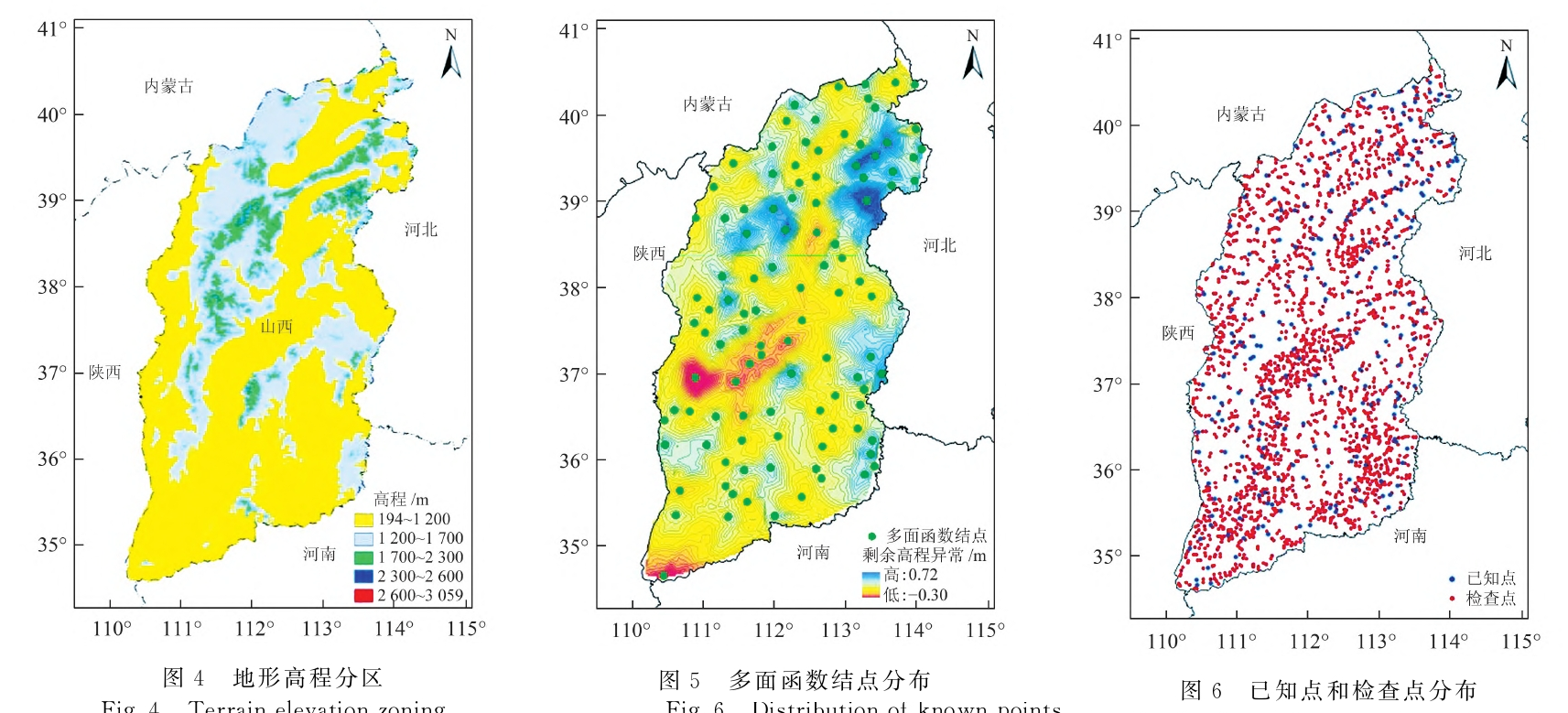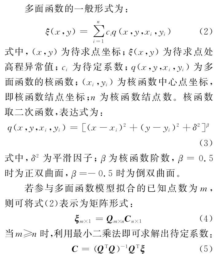 文献6通过绘制剩余高程异常等值线来确定结点位置和数量,共选择山顶106个。收集 2156个高程异常控制点,参照结点位置,测区选定243个点作为已知点,参与多面函数系 数计算,其余1913个点作为检查点。平滑因子选择20000。经评估计算,外符合精度为5cm。
