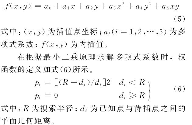 通常已知点数不少于6个,根据最小二乘原理求解出多项式系数后,将待插点坐标代入多项式即可求得待插点处的函数值。随着待插点位置的不断变化,拟合函数曲面也会随之不断移动。当搜索半径R范围内的已知点数少于6个时,可适当增大搜索范围。