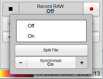 You can record both RAW and processed data using the Record RAW and Record Processed functions. It may be useful to synchronize these two functions to automatically record all data formats simultaneously. To synchronize the recording functions, open the Record RAW button, and set Synchronize to On. The Record Processed button is then inhibited, and you can start and stop all recording by means of the Record RAW button.