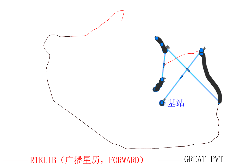 将PRIDE解算结果展布在上文图形中,见下图,图中选中的线段是PRIDE解算结果,从图中可以看出,只有中间一段定位轨迹与RTKLIB2.5重合。